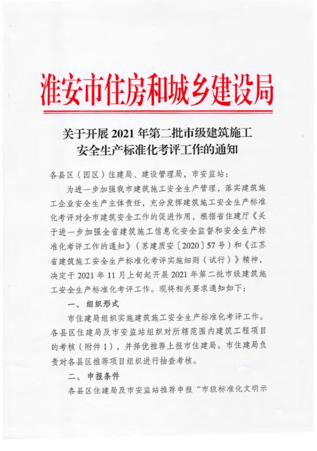 關(guān)于開展2021年第二批市級(jí)建筑施工安全生產(chǎn)標(biāo)準(zhǔn)化考評(píng)工作的通知