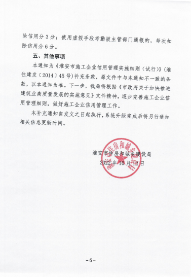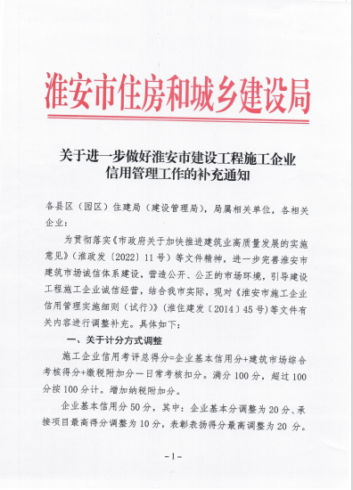 關于進一步做好淮安市建設工程施工企業(yè)信用管理工作的補充通知