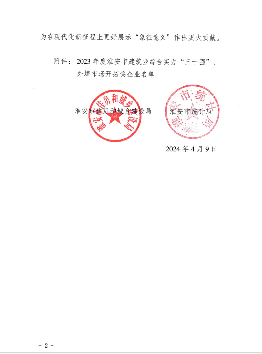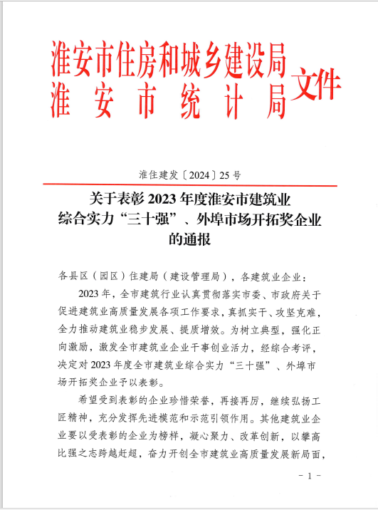 近日,從淮安市住房和城鄉(xiāng)建設(shè)局傳來(lái)喜訊,經(jīng)綜合考評(píng), 北方路橋再次蟬聯(lián)2023年度淮安市建筑業(yè)外埠市場(chǎng)開(kāi)拓獎(jiǎng)十強(qiáng)企業(yè)稱號(hào)。