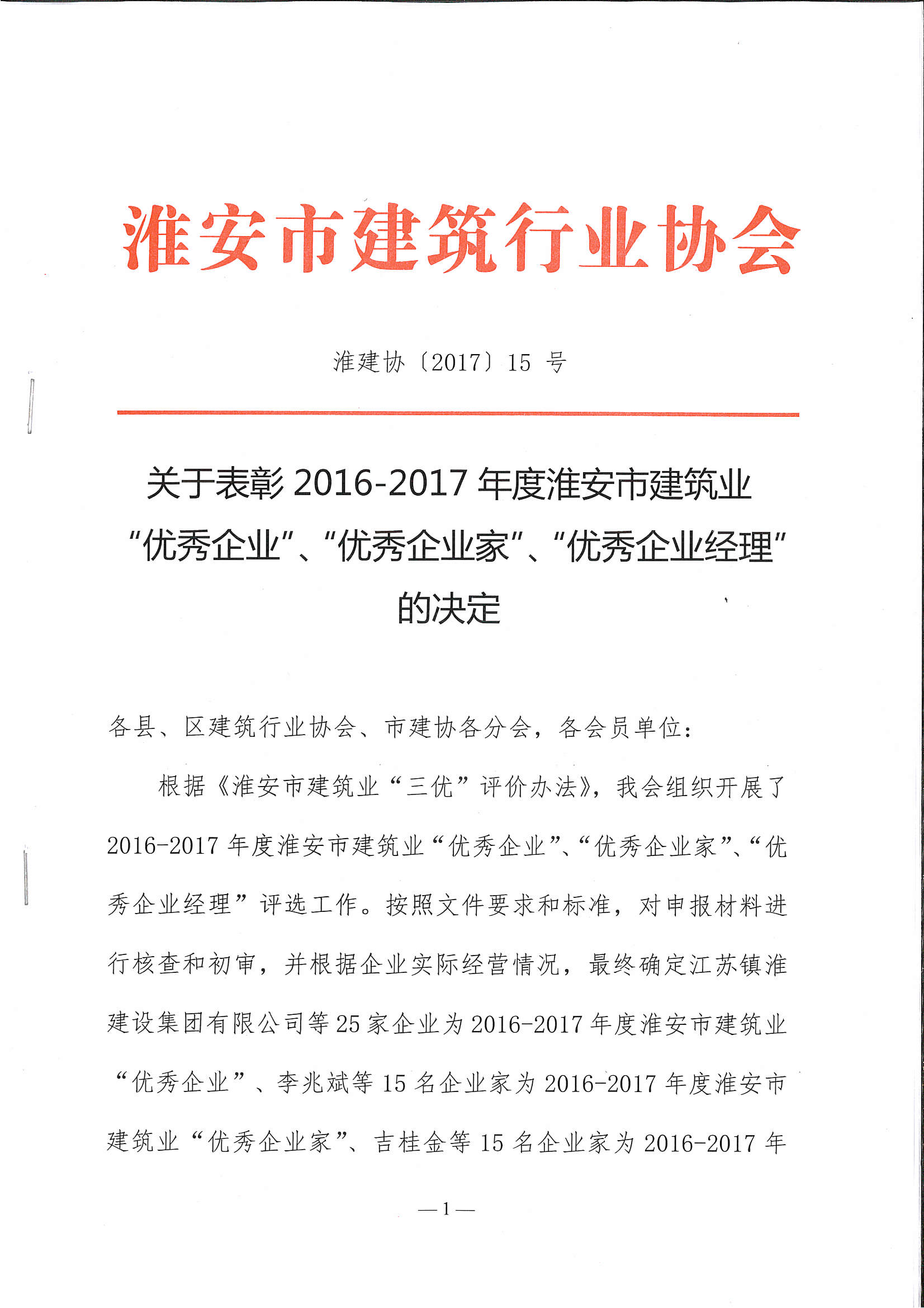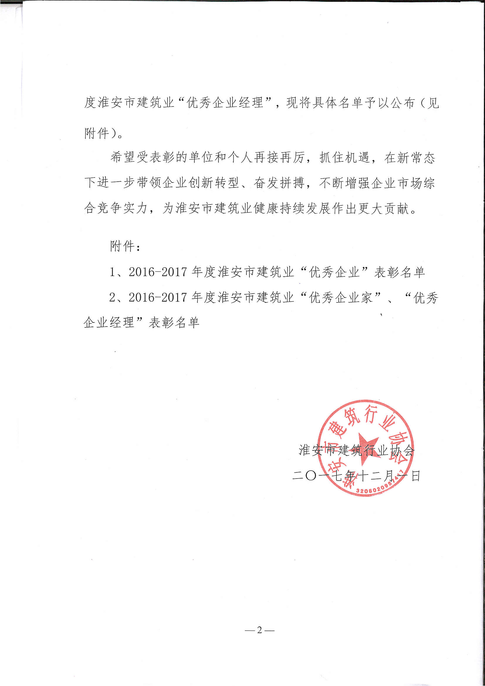 我公司榮獲“2016-2017年度淮安市建筑業(yè)優(yōu)秀企業(yè)”稱號