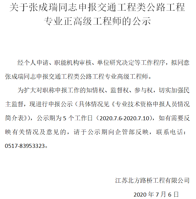 關(guān)于張成瑞同志申報交通工程類公路工程專業(yè)正高級工程師的公示