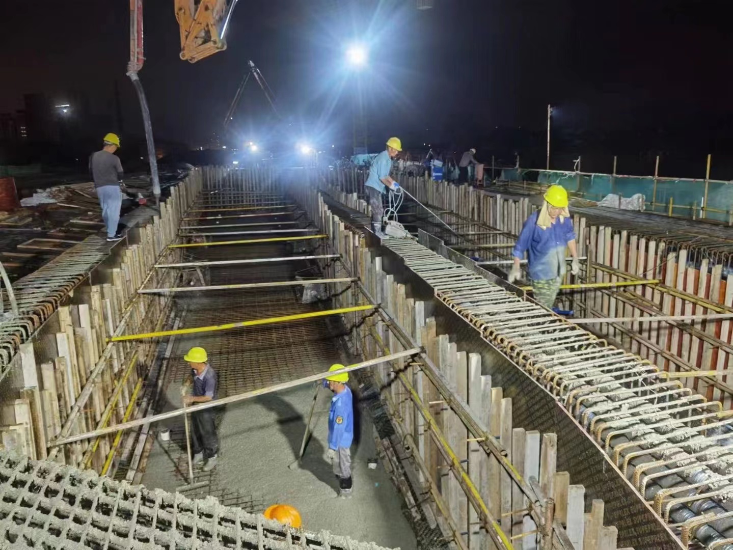 7月26日,江陰花北路橋箱梁底腹板砼澆筑作業(yè)現(xiàn)場。